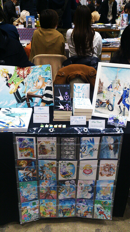 イラスト本Skyblue、クロリアの蒼い笛上下巻、イメージカラーシリーズ、ポストカード、名刺、それから制作中の新作原画。