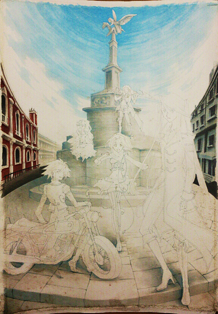 ちょっと一部まだ物足りないのですが、背景ばかり一生懸命描いていても仕方ないので、明日からはキャラの塗りに移ります。