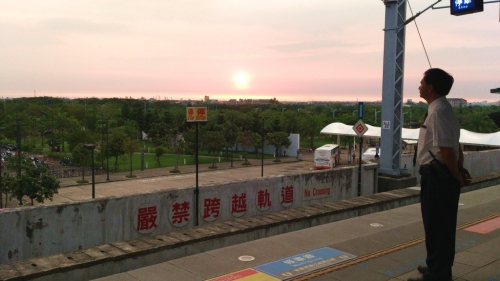 沙崙駅のプラットフォームで夕日に向かって黄昏れてる駅員のおじさん。